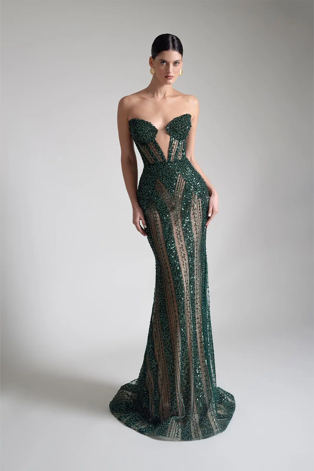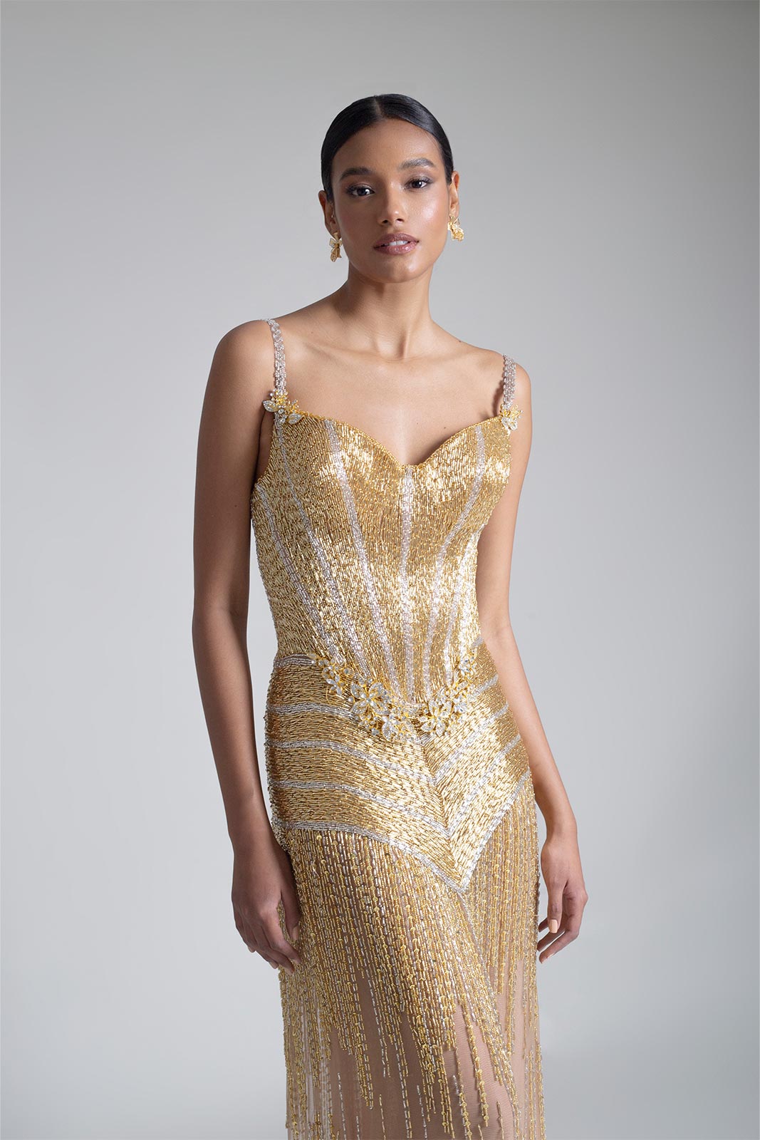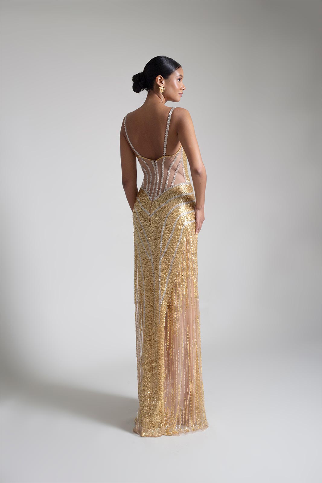 Vestido silueta sirena con bordado en lineas completamente a mano con canutillos y mostacilla, apliques y transparencias.