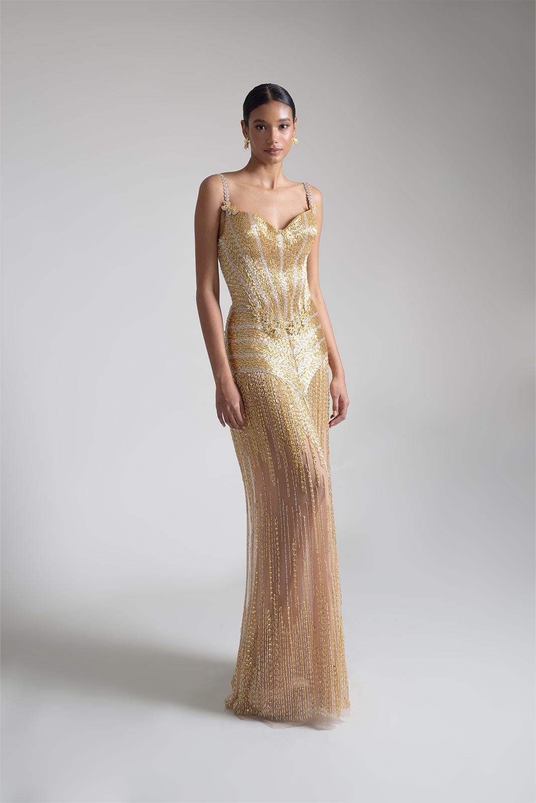 Vestido en body con flecos largos recudamos en canutillo y mostacilla, un bordado completamente a mano con diferentes tonalidades de azul.