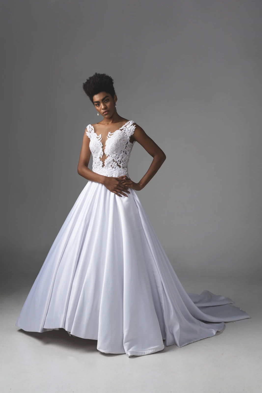 Vestido tipo princesa, bordado en encaje de arabescos y flores 3d, escote bandeja en v, espalda profunda. Falda bordada a mano en canutillos